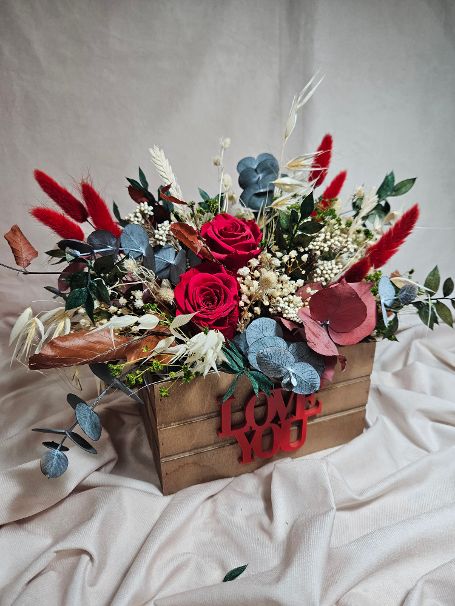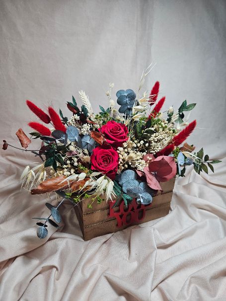 Caja LOVE se trata de una creación realizada sobre caja de madera y flores preservadas.